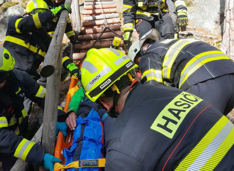 Na místo vyjeli profesionální hasiči z Turnova, dobrovolní hasiči z obce Koberovy a lezecká skupina ze semilské stanice. „Zraněnému zasahující na místě poskytli první předlékařskou pomoc a následně jej umístili do nosítek, zabezpečili a pomocí lanových technik dostali prudkým terénem bezpečně v nosítkách nahoru na cestu,“ popsala záchrannou akci na Železnobrodsku tisková mluvčí hasičů Jaroslava Benešová.