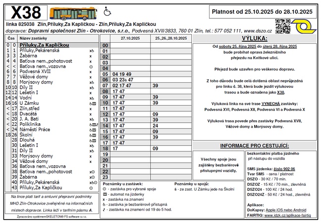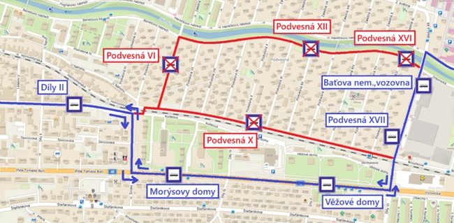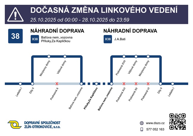 „V uvedené dny povede výluková trasa po třídě T. Bati mimo ulici Hornomlýnská a zastávky Podvesná VI, X, XII, XVI.,“ sdělil Jan Tesař, vedoucí dispečer DSZO. Linka bude označena jako X38 po výlukové trase. Spoje na Kapličku budou označeny standardně 38g. Spoje budou na výlukové trase zastavovat na zastávkách Věžové domy, Morýsovy domy a Podvesná XVII.