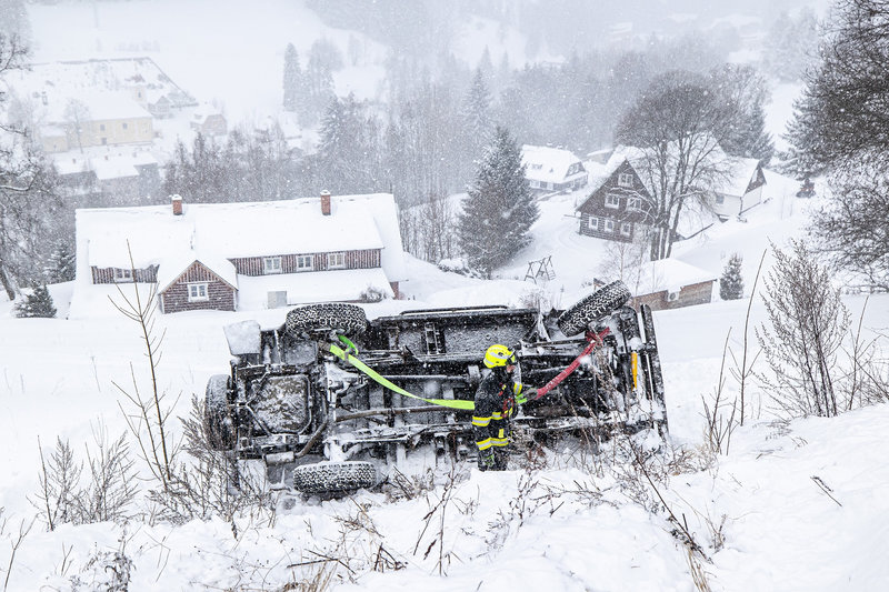 „Automobil se nacházel na boku a hrozilo jeho převrácení ze svahu,“ popsala situaci mluvčí hasičů Zuzana Strouhalová. „Hasiči vůz stabilizovali, následně jej převrátili zpět na kola a ve spolupráci s traktorem bezpečně svažili na komunikaci.“