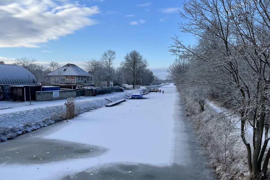 VESELÍ NAD MORAVOU – Díky nízkým teplotám posledních dnů pokryl Baťův kanál led. Avšak pozor, přírodní led není nikdy dokonale bezpečný, proto dbejte zvýšené opatrnosti. Nikdy nevstupujte na led, pokud nevíte, jak je silný!