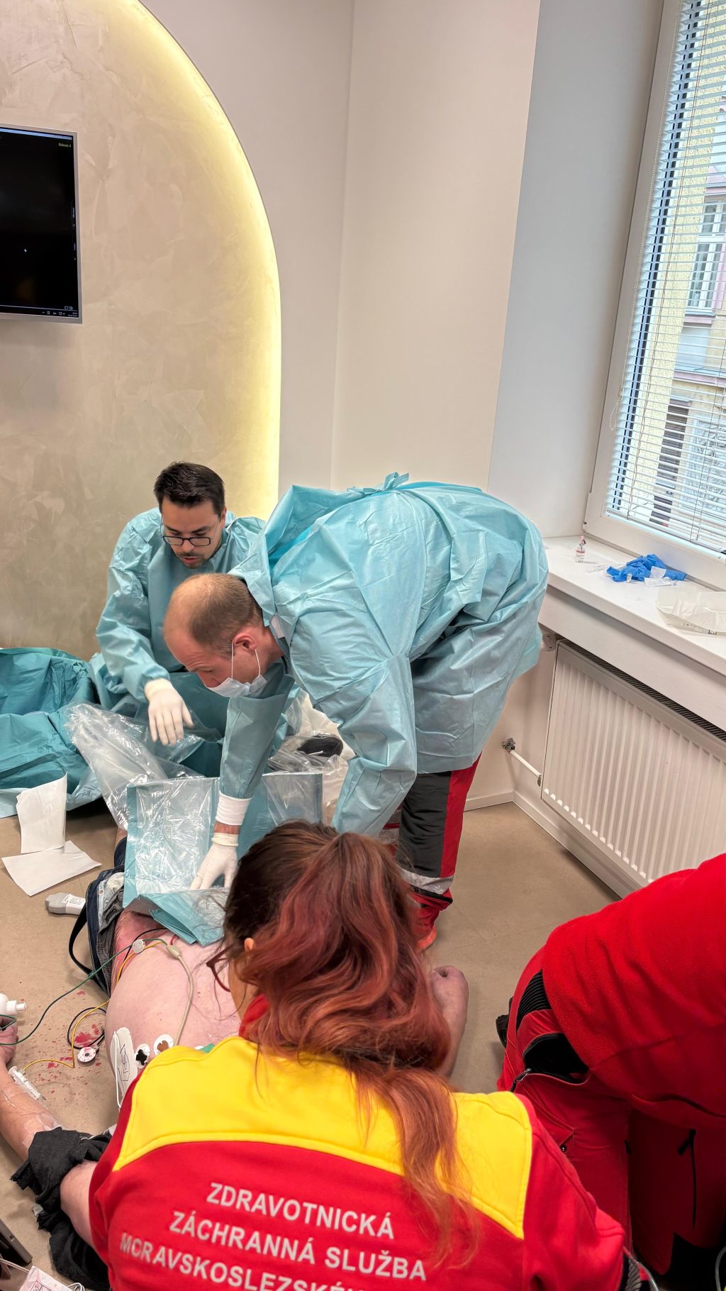 Dispečer Zdravotnické záchranné služby Moravskoslezského kraje, který vyslal posádku, zároveň informoval ECMO tým FN Ostrava. „Mobilní telefon zazvonil mně, sestře i řidiči sanity a během chvilky jsme společně vyrazili do přibližně 12 kilometrů vzdálené ordinace. Na místě jsme muže za nepřetržité resuscitace napojili na mimotělní krevní oběh a transportovali ho k nám do nemocnice, kde už byl připraven kardiologický tým,“ popsal výjezd jeden ze dvou zasahujících lékařů Michal Frelich. Od momentu srdeční zástavy po napojení pacienta na ECMO uběhlo pouhých 45 minut.