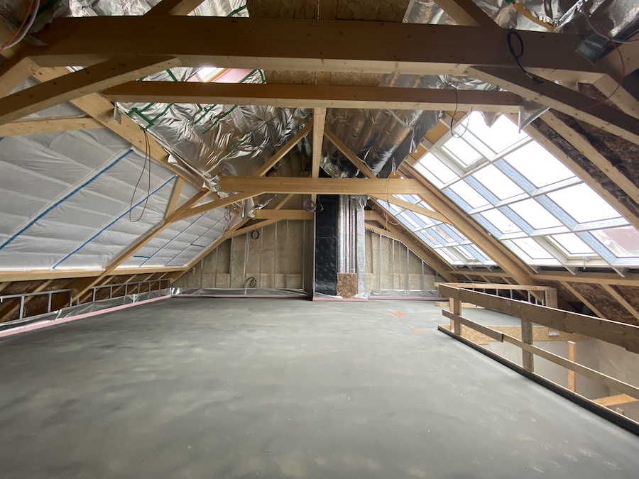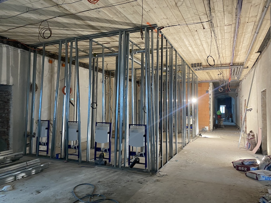 Stavbaři aktuálně osazují elektroinstalace, otopnou soustavu, vodovod i vnitřní kanalizaci, omítají a štukují zdi a montují sádrokartony pro sociální zařízení. V přízemí se pokračuje s betonáží podlah a v podkroví se připravují hrubé rozvody pro vzduchotechniku.