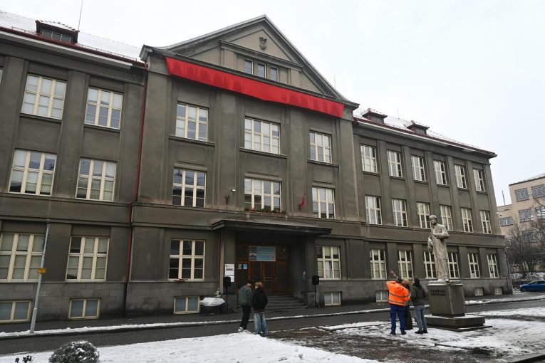 Obchodní akademie ve Slaném slavnostně odhalila obnovený nápis na budově školy