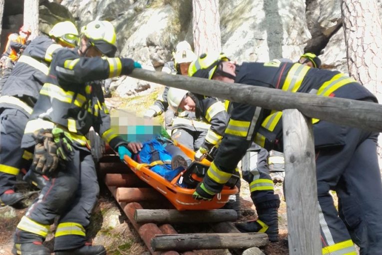 Turista se zranil na Suchých skalách. K sanitce ho nesli hasiči prudkým terénem