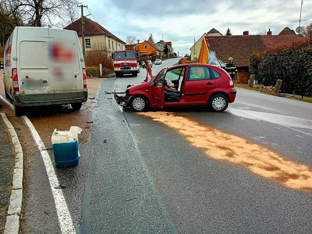 Poté hasiči společně s policisty museli vyřešit jak provoz na silnici v místě nehody, tak překládku nákladu z dodávky.