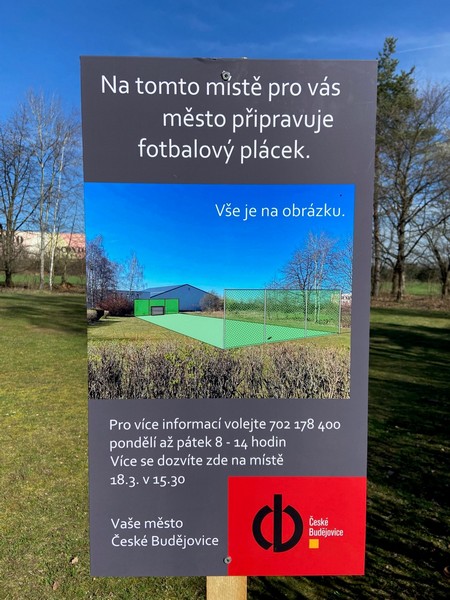 „Občan nám dal zajímavý podnět, že na Pražském sídlišti chybí místo, kde by si děti a teenageři mohli s rodiči, i jen tak zahrát fotbal či jiné venkovní míčové aktivity. Protože se dlouhodobě snažíme, aby dospělí i děti měli ve městě pestrou nabídku sportů, tak jsme vytipovali toto místo, kde bychom chtěli rychle vybudovat jednoduché hřiště. Zároveň tento záměr chceme projednat s místními obyvateli a do záměru zapracovat jejich podněty. Proto jsme k plácku umístili informační ceduli o záměru a s telefonním číslem, e-mailem, na kterém nám občané mohou říct svůj názor. Veškeré informace potom Budějčákům na místě poskytneme a společně probereme v pondělí 18. března od půl čtvrté. Chtěl bych pozval všechny, které tyto věci zajímají, rádi vyslechneme jejich názory k tomuto záměru,“ přibližuje náměstek primátorky Michal Šebek.