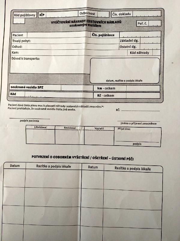 Ošetřující lékař musí tedy nemocnému tento druh dopravy vždy předem schválit a vystavit tiskopis „Vyúčtování náhrady cestovních nákladů soukromým vozidlem“, tzv. cestovné pacientů.