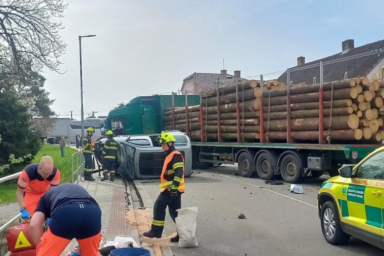 Kamion se dřevem se střetl s osobním autem. Jedna žena utrpěla zranění