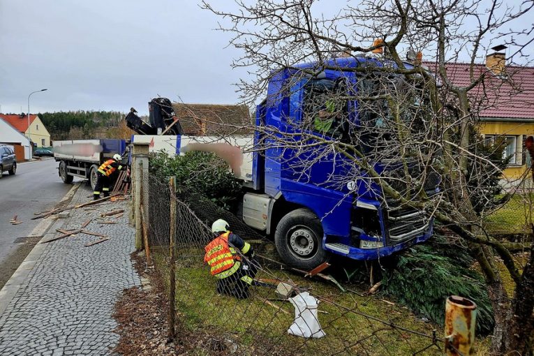 Hasiči zasahují na Písecku u nehody náklaďáku. Ten vjel do zahrady
