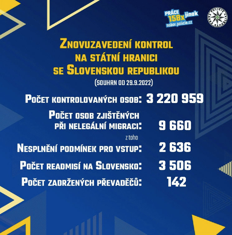Od nedělní půlnoci skončilo znovuzavedení kontrol na vnitřní hranici se Slovenskem a zároveň i posilování služeb na hranicích policisty z celé republiky. Podle policejního mluvčího Pavla Švába od začátku opatření policisté spolu s vojáky a celníky zjistili celkem 5973 migrantů. Z trestného činu organizování a umožnění nedovoleného překročení státní hranice se zodpovídalo 97 osob. „Od čtvrtka přecházíme do režimu namátkových kontrol na předem vytipovaných místech, přičemž pokračovat budou i společné česko-slovenské policejní hlídky. V první fázi nasadíme do kontrolní činnosti více než 70 policistů na směnu,“ napsali policisté na Twitru.