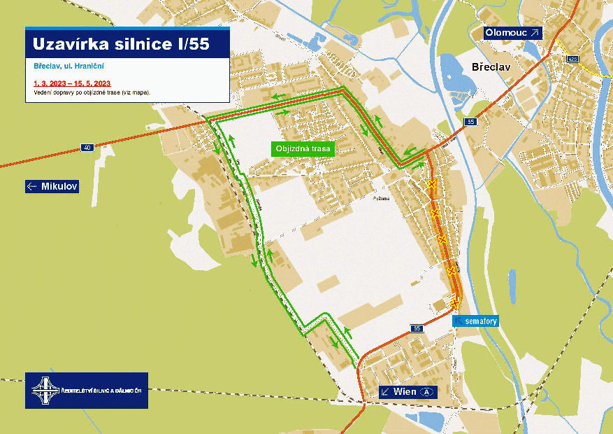 Silnici I/55 v břeclavské části Poštorná v Hraniční ulici se začne opravovat už ve středu 1. března. Půjde o výměnu krytu vozovky komunikace I/55 mezi 136,838. až 137,849. kilometry. Na základě výsledků diagnostiky dojde k odfrézování krytu vozovky, posouzení a následné lokální sanaci a dále k pokládce ložní a obrusné vrstvy. Součástí plánovaných prací bude také oprava dešťových vpustí a obnova vodorovného dopravního značení. Vozovka, jejíž stáří je přibližně 20 let, vykazuje trhliny a výtluky. Oprava vyjde na 15,3 milionů Kč bez DPH. Dokončení prací plánujeme nejpozději v polovině května. Hraniční ulice bude během opravy neprůjezdná a řidiči budou jezdit po objízdné trase, která vede po souběžných místních komunikacích viz mapka. Objízdná trasa začíná u křižovatky třídy 1. máje s ulicí Jana Skácela, pokračuje ulicí Na Valtické a odbočkou před železničním přejezdem do ulice Díly, podél kolejí Nádražní ulicí. Polní cestou, která bude pro potřeby objížďky nově zpevněná, projedou řidiči kolem areálu společnosti Lamé, kudy se opět dostanou na silnici I/55.
