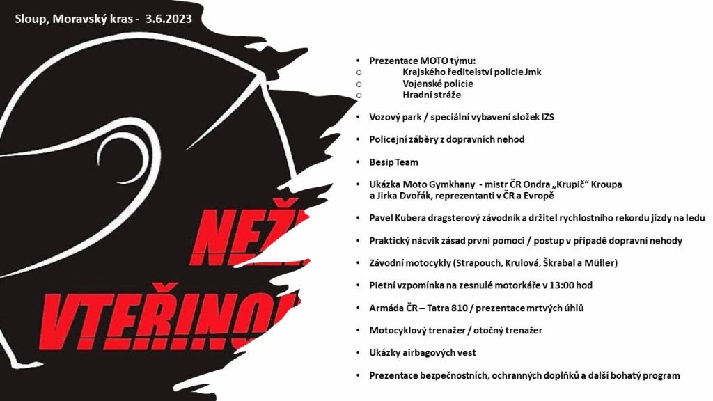 Nejen pro motorkáře policisté připravili bohatý ucelený program. Prezentovat se budou mototýmy hradní stráže, dopravní i vojenské policie. Na místě budou k dispozici ukázky techniky, výstroje a vybavení jednotlivých složek integrovaného záchranného systému. Svou úlohu zde budou mít i kolegové z Vojenské akademie Vyškov, kteří zde budou prezentovat takzvané mrtvé úhly. Při vstupu do jeskyně nebudou chybět policejní záběry z dopravních nehod. Pro připomenutí zásad bezpečné jízdy si budete moci vyzkoušet testy, zaměřené na cílovou skupinu. Doprovodný program obohatí ukázka Moto Gymkhany, které nás svou návštěvou poctí reprezentanti ČR i Evropy Ondra „Krupič“ Kroupa a Jirka Dvořák. Pozvání přijal také dragsterový závodník Pavel Kubera. Ukázky závodních motocyklů představí Strapouch, Krulová, Škrabal a Müller. V rámci preventivního programu proběhne tradiční uctění památky zesnulých motorkářů.