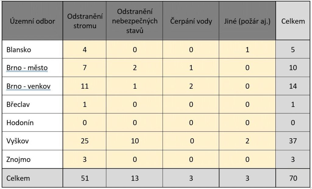 Už v sobotu hasiči v celém kraji museli řešit následky poledních bouřek. V celém Jihomoravském kraji hasiči vyjížděli do 12:30 hodin k 23 událostem v souvislosti s počasím. Zejména se jednalo o popadané stromy. „Škody, které bouřka způsobuje, jsou zejména okolo Brna-města a venkova,“ uvedli jihomoravští hasiči na síti X. Následky další vlny bouřek hlásili hasiči hlavně z okresu Vyškov. Právě tam odklízeli následky bouřek také v neděli od rána. K 23. hodině evidovali celkem 44 událostí, k 23:30 už 60 událostí. „Po rozednění řešíme následky bouřky, která se prohnala naším krajem. Nejvíce práce máme stále na Vyškovsku,“ uvedli v neděli hasiči. Nejvíce následků likvidovali v obci Hodějice. Zejména se jednalo o popadané stromy a poškozené střechy, například ze střechy školy uletěly tašky, dále také čerpání vody. Na místě se sjely jednotky a proběhla porada velitelů. „Situace v obci Hodějice je stabilizovaná. Řešili jsme na místě k 50 událostem. Za pomocí dobrovolných jednotek, profesionálních a místních občanů se podařilo následky odstranit. A redukujeme síly a prostředky v místě zásahu,“ doplnili hasiči před polednem. Video na facebooku.