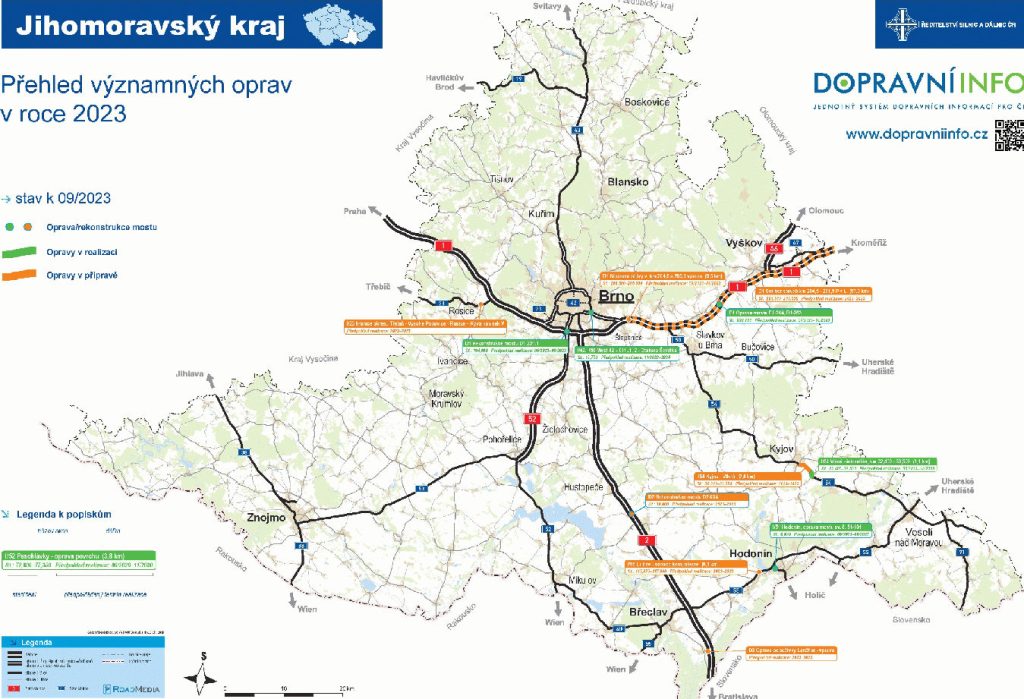 V pondělí začali silničáři opravovat poškozený povrch silnice I/54 v obci Vlkoš. Provoz je veden kyvadlově a řídí ho semafory. Dokončení prací v tomto úseku plánuje ŘSD do konce září. V říjnu naváže akcí I/54 Kyjov – Vlkoš. Podrobnosti ještě upřesní. Ve středu 6. 9. se začne pracovat na 204,5 až 205. kilometru dálnice D1 v směru na Kroměříž a na nouzových zálivech u Rohlenky. Provoz bude zachován v režimu 2+2 pruhy. Dobrá zpráva je, že silničáři dokončili stavbu protihlukové stěny na dálnici D2 u obce Starovičky mezi 30,2. až 31. kilometru ve směru na Břeclav. Úsek je opět průjezdný bez omezení. Stěna má délku 800 metrů a výšku 3,5 metru.