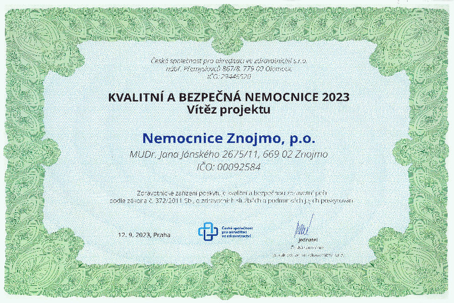 Letos již po jedenácté vyhlásila Česká společnost pro akreditaci ve zdravotnictví vítěze projektu Kvalitní a bezpečná nemocnice. „Plaketu Kvalitní a bezpečné nemocnice získávají ty nemocnice, které byly v uplynulém roce akreditovány a současně byly auditory vyhodnoceny jako kvalitní a bezpečné zdravotnické zařízení, a to za nadstandardní a vysoce kvalitní přístup k řízení kvality a bezpečí, pacientům a zaměstnancům. Významným kritériem je také dosažený pokrok v oblasti kvality poskytované zdravotní a ošetřovatelské péče. Hlavním smyslem ankety je ocenit odpovědné pracovníky, kteří se podílejí na řízení kvality a bezpečí poskytované péče i zaměstnance, kteří nastavená pravidla dodržují,“ uvedla jednatelka a konzultantka České společnosti pro akreditaci ve zdravotnictví Renata Podstatová.