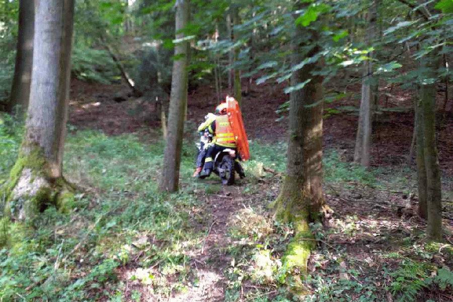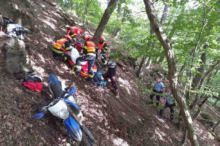 Komplikovaná dopravní nehoda motocyklu se stala v neděli před polednem u obce Olšany na Vyškovsku. Motorkář spadl mimo lesní cestu do nepřístupného terénu. Zraněného motorkáře hasiči vytáhli z nepřístupného terénu v transportní vaně. Následně byl transportován do vrtulníku. „Mladý muž utrpěl poranění nohy. Jelikož byl ve špatně přístupném terénu, pomohli nám s jeho přepravou k sanitce hasiči s vrtulníkem,“ popsala mluvčí záchranářů Michaela Bothová. Při záchraně svého kamaráda spolupracovali další motorkáři, kteří odváželi příslušníky a záchranáře ke zraněnému.