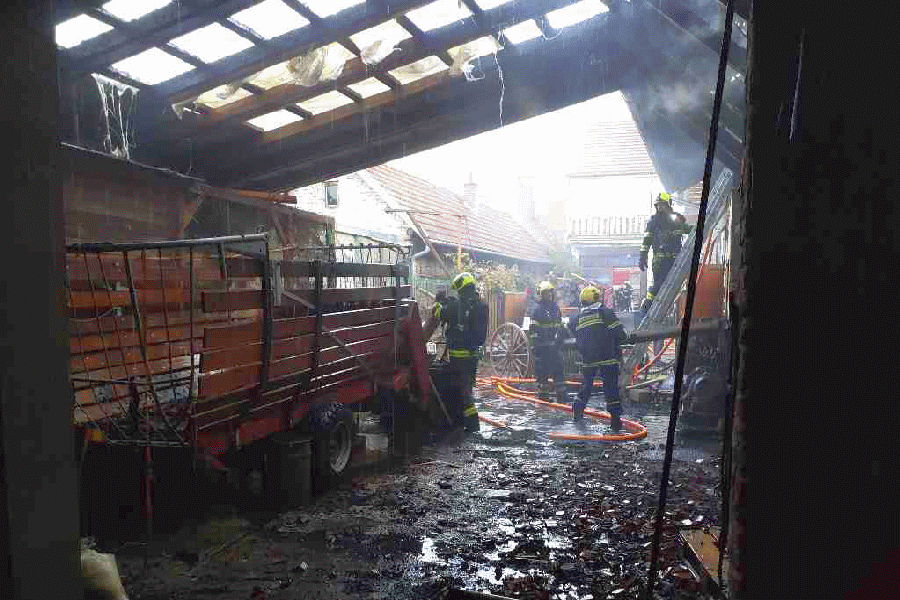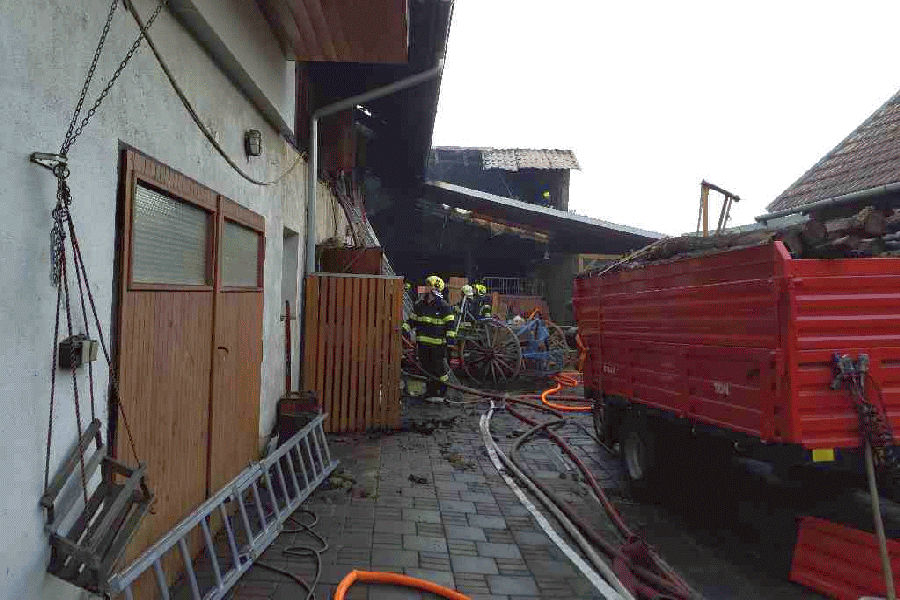 Při požáru hospodářského stavení v obci Veverská Bítýška hasiči postupně nasadili do boje proti plamenům 6 vodních proudů. Plameny zcela zničily bagr. V 17.10 hodin oheň dostali pod kontrolu. Následně rozebírali dřevěné stropy a hromady sena. Požár byl zcela uhašen v 20 hodin. „Vyšetřovatel vyčíslil předběžně škodu na 2 miliony korun. Hasiči svým zásahem uchránili majetek v hodnotě 10 milionů korun,“ vyčíslil mluvčí hasičů Petr Příkaský. Příčinou vzniku požáru je neodborná manipulace s hořlavou kapalinou.