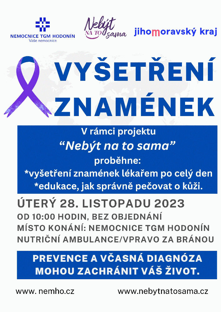 Všichni, kteří do hodonínské nemocnice zavítají v úterý 28. listopadu od 10.00 do cca 15.00 (dle zájmu) na akci s edukativním podtextem v rámci projektu Nebýt na to sama, se mohou v tento den dozvědět, jak správně pečovat o kůži, a také nechat si tu svou bezplatně prohlédnout odborníkem, Jedině pravidelná kontrola kožních znamének totiž může odhalit podezřelé změny na kůži včetně nejagresivnější formy rakoviny kůže – melanomu, a zajistit tak případnou co nejrychlejší léčbu. Pokud tedy chcete získat odbornou radu a ujistit se, zda je vše v pořádku, zve vás nemocnice do nutriční ambulance, která je vpravo za bránou. Jestliže lékař odhalí nebezpečný melanom včas, zvyšuje se tak pravděpodobnost úspěšnosti celé léčby a úplného vyléčení pacienta.
