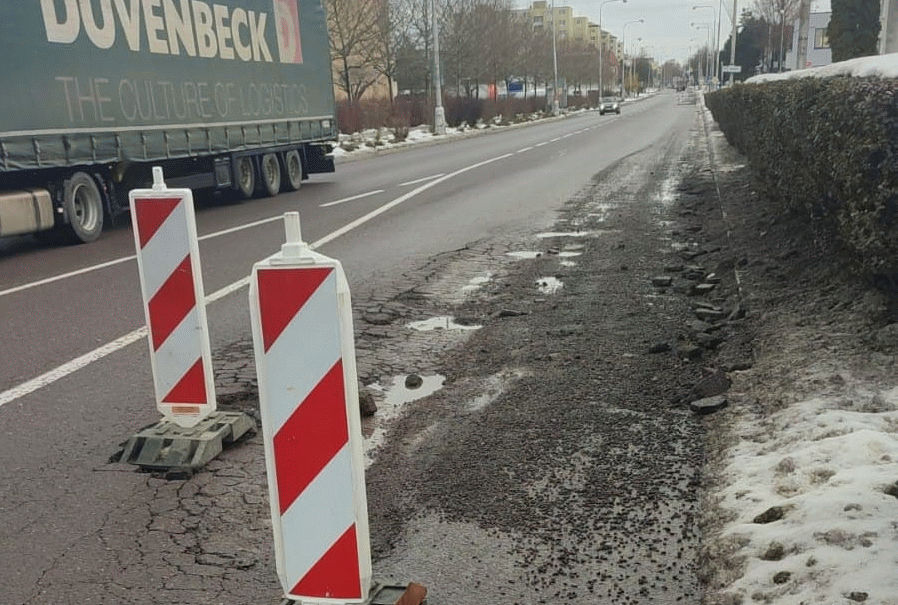 Na silnici I/38 ve Znojmě v Pražské ulici je havarijní stav poškozeného povrchu vozovky, který si žádá opravu. V tuto chvíli už je problematické místo alespoň označené dopravním značením, takže přijíždějící řidiče včas upozorní. „Zítra povrch vozovky odfrézujeme a následně položíme asfaltové vrstvy. Hotovo chceme mít do konce týdne. Provoz bude veden kyvadlově a řízen pracovníky s vysílačkami,“ slíbil ředitel ŘSD JMK David Fiala.