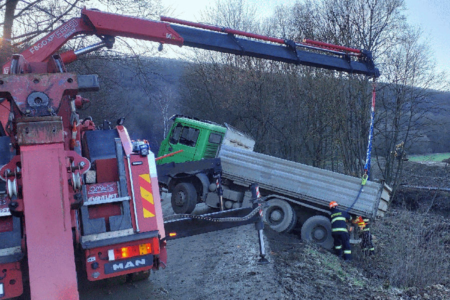 Hasiči zasahovali v pátek odpoledne v Tetčicích-Omicích na Brněnsku u dopravní nehody dvou nákladních automobilů. Na asfaltové silnici zablácené od vozidel ze stavby dostal nákladní vůz smyk při vyhýbání se kamionu, který byl částečně v protisměru, a zůstal viset na nezpevněné krajnici. Řidič nákladního vozu měl velké štěstí, nehoda se obešla bez zranění. „Za využití vyprošťovacího automobilu z CHS Brno – Lidická se nám podařilo vrátit vozidlo zpět na komunikaci,“ uvedli hasiči na své stránce.