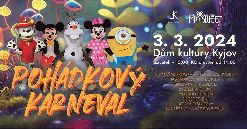 Zveme všechny naše malé i velké kamarádky a kamarády na Pohádkový karneval pro děti v Kyjově. Uvidíte pohádkové postavičky v životních velikostech: Masrhalla, Šmoulu, Mavise, Minnie, Mimoně, krále Jelimána, lva Alexe či Oláfka. Nebude chybět světelná show pro děti a animační disko-program pro celou rodinu. Dále je připraveno malování na obličej, soutěže ve zpívání a tancování o pohádkové ceny, výrobníky bublin nebo soutěž o nejhezčí a nejoriginálnější kostým. Karneval se bude konat v neděli 3. března 2024 v Domu kultury Kyjov od 15:00 hodin. Kulturní dům bude otevřen pro veřejnost od 14:00 pro odbavení vstupenek. Předprodej vstupenek je zde: 100 Kč na jednu osobu, na místě 120 Kč za osobu, děti do 2 let vstup zdarma. Hlavní partner akce je Nejlepší dovozce cukrovinek MP SWEET,