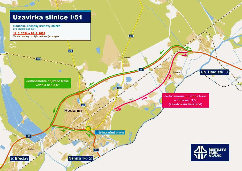 Už v polovině března začnou silničáři opravovat okružní křižovatku v Hodoníně. V termínu od 11. 3. do 20. 4. 2024 nahradí kostky z prstence za betonový kryt a vymění asfaltový povrch vozovky. Práce budou rozděleny na dvě etapy, k nimž bude navázáno dopravní omezení. V rámci první etapy od 11. 3. do 5. 4. budou uzavřeny tři čtvrtiny opravované okružní křižovatky. Provoz na silnici I/51 bude veden kyvadlově a řízen semafory. V této etapě prací bude uzavřen vjezd do Dvořákovy ulice a části Velkomoravské ulice. „Ve druhé etapě od 6. 4. do 20. 4. zprovozníme již opravené ¾ křižovatky a doděláme zbývající čtvrtinu rondelu. Provoz na silnici I/51 bude opět veden kyvadlově a řízen semafory,“ upřesnilo ŘSD na své stránce.