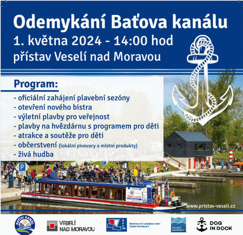 Oficiální zahájení plavební sezóny na Baťově kanálu proběhne 1. května ve 14 hod přímo v přístavu ve Veselí nad Moravou za přítomnosti členů vlády, hejtmanů Jihomoravského a Zlínského kraje, vedení Ředitelství vodních cest, Povodí Moravy, Státní plavební správy a starostů měst a obcí, jejichž územím Baťův kanál protéká. Slavnostnímu programu bude předcházet odborná konference věnovaná 90. výročí zahájení výstavby Baťova kanálu, která představí řadu zajímavých informací z historie i současnosti této vodní cesty. Konference proběhne v úterý 30. dubna od 13,30 hodin ve velkém sále Panského dvora v centru Veselí nad Moravou. Areál veselského přístavu prošel v uplynulých měsících opět velkou proměnou. Soukromý investor zde vybudoval nové apartmánové bydlení se stovkou lůžek a moderní gastronomické zázemí – bistro Dog In Dock ve tvaru lodi. Vjezdu do areálu přístavu a k novým apartmánům bude nově vévodit umělecké dílo známého českého sochaře Davida Černého. Jedná se o čtyřmetrové sousoší psů, které vtipně souvisí s názvem vinařství.