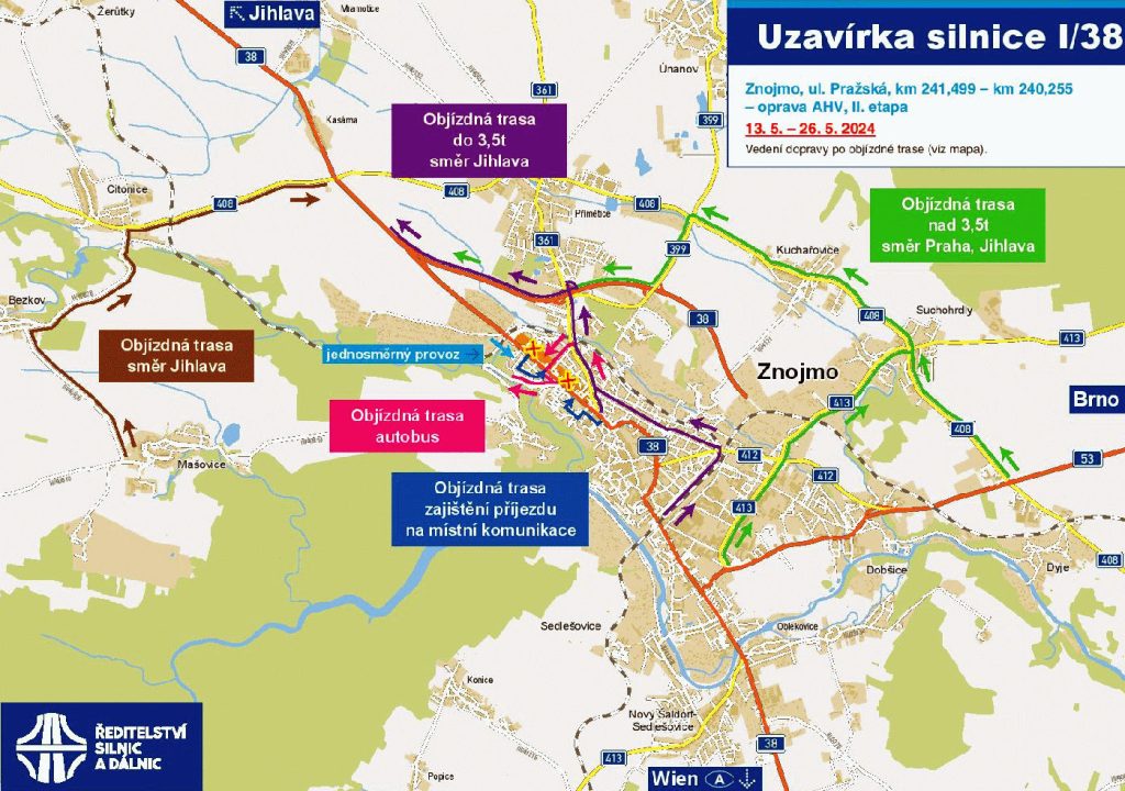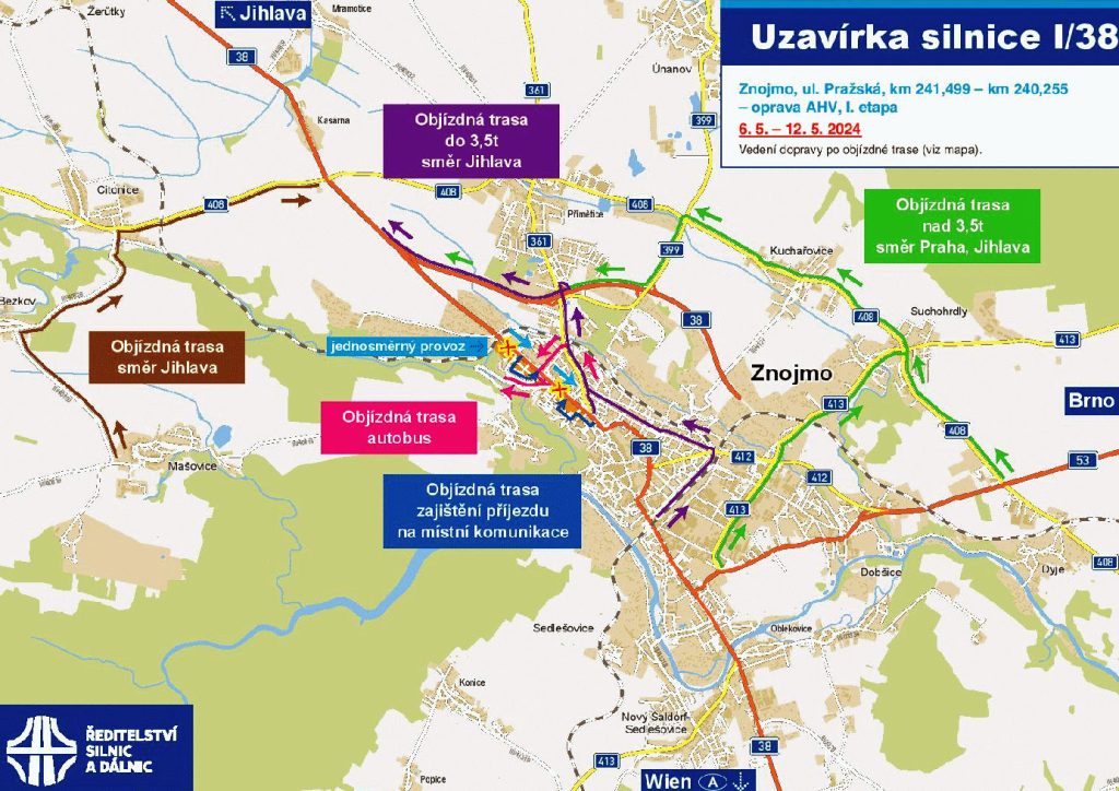 Od 6. do 26. května se bude opravovat ulice Pražská, od mostu před čerpací stanicí ÖMV po křižovatku Slovenská. Provoz bude veden jednosměrně ve směru od Jihlavy na Vídeň, v opačném směru budou vyznačeny objízdné trasy. Na Mariánském náměstí proběhne oprava kruhového objezdu od 6. do 26. května. Pracovat se zde bude po polovinách, průjezd stavbou bude veden kyvadlově. Pro vozidla do 3,5 t a nad 3,5 t jsou stanoveny objízdné trasy. V 1. etapě od 6. do 13. května bude uzavřena část okružní křižovatky přilehlá k ulici Studentská a Pontassievská. Při vjezdu z ulice Rooseveltova a 17. listopadu bude umožněno pouze levé odbočení ve směru na Vídeň. Pracovat bude ŘSD po polovinách do 24. 5. Ulice Pražská bude vždy průjezdná pouze jednosměrně. Bude uzavřen směr do centra. Budou značeny objízdné trasy pro vozidla do 3,5 tun a nad 3,5 tun. V 2. etapě od 14. května do 22. května bude uzavřena část kruhového objezdu přilehlá k silnici Rooseveltova, Alšova a ulici 17. listopadu. Z ulice Studentská a Pontassievská bude umožněno jen pravé odbočení, tj. na Vídeň. Více info zde.