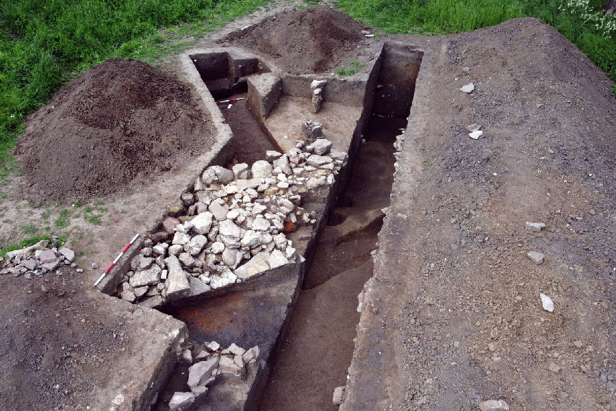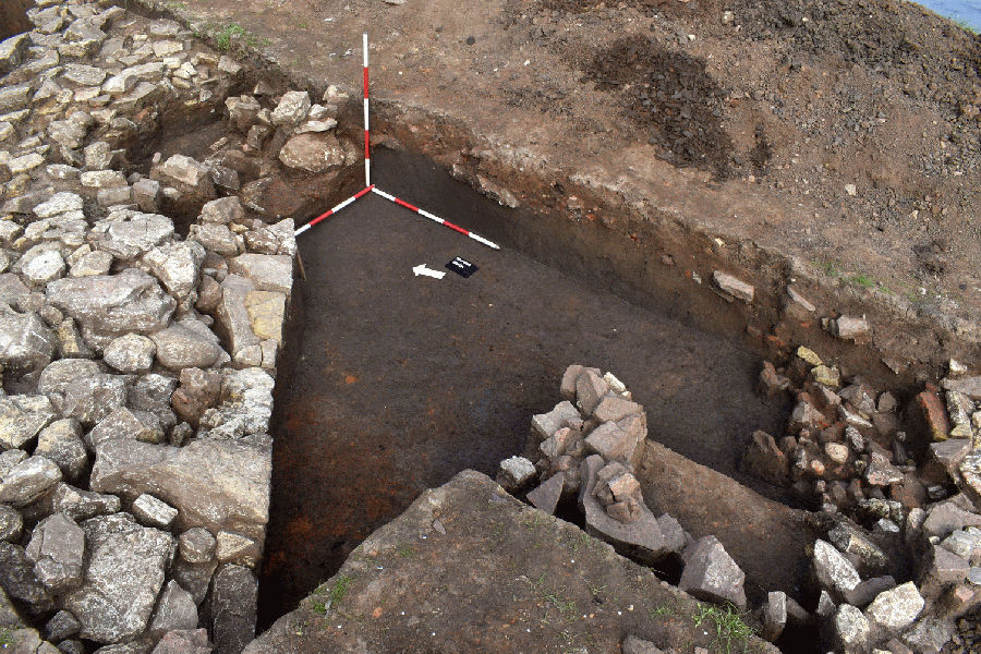 Záchranný výzkum byl vyvolán těžbou zeminy pod jezem Rajhrad na pravém břehu řeky Svratky, která byla potřebná pro údržbu nedaleké protipovodňové hráze. V částečně sníženém terénu byla zaznamenána koncentrace kamenů, jejíž umístění odpovídalo předpokládanému průběhu zničeného valového opevnění hradiště. Příčná sonda potvrdila, že se skutečně jedná o zbytky kamenné zdi. Pozůstatky zdi mají šířku minimálně 10 metrů a ležely na nezasaženém terénu nadložních vrstev, který jižním směrem vně hradiště sice mírně klesal, ale příkop zde nebyl zachycen. Více informace najdete zde.