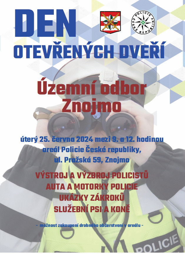 Kdo má zájem prožít pár hodin s policií, nechť se dostaví v úterý 25. června do areálu Policie České republiky na Pražské ulici ve Znojmě. Policisté nabídnou mezi 9. a 12. hodinou k prohlédnutí jejich techniku, výzbroj i výstroj a také různé ukázky výcviků a zákroků. Představí se zde například policisté z obvodního oddělení, dopravní policisté, cizinecká policie, kriminalističtí technici, speciální pořádková jednotka, psovodi, policejní potápěči, pyrotechnici, policisté na koních, ale i zásahová jednotka. V 9:30 hosty a návštěvníky přivítá ředitel územního odboru Znojmo plukovník Pavelka a potom budou následovat dynamické a statické ukázky jednotlivých policejních složek z Brna a ze Znojma. „Srdečně tedy zveme malé i velké diváky, hosty, zájemce o naši práci, budoucí policisty a naše fanoušky. Vstup do areálu bude umožněn přes vrátnici naproti katastrálnímu úřadu. Těšíme se na Vás,“ pozvala policejní mluvčí Lenka Drahokoupilová.
