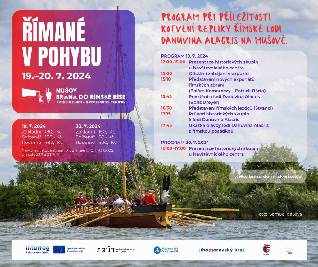 V zázemí centra Mušov – Brána do Římské říše se 19. července po poledni setkáte s několika historickými skupinami římských legionářů. Po oficiálním zahájení se seznámíte s novými exponáty expozice, včetně římských zbraní a jejich replik. Představí je ředitel Archeologického ústavu AV ČR Brno Balázs Komoróczy a konzervátor a umělecký kovář Patrick Bárta. Poté si vyslechnete povídání o unikátní replice římské veslice Danuvina Alacris od tvůrce celého projektu Prof. Dr. Borise Dreyera s českým překladem. Následně předvede jedinečná skupina Štvanci představení římských jezdců v zázemí návštěvnického centra. A nakonec se odebereme slavnostním pochodem s římskými legionáři i jezdci k lodi Danuvina Alacris, s níž pak posádka poprvé vypluje. Držte si klobouky a taky nám držte palce! Těšíme se na vás,“ uvedlo centrum. Na Mušově bude loď kotvit od 19. července do 5. září 2024. Loď kotví díky pomoci Autokemp ATC Merkur Pasohlávky.