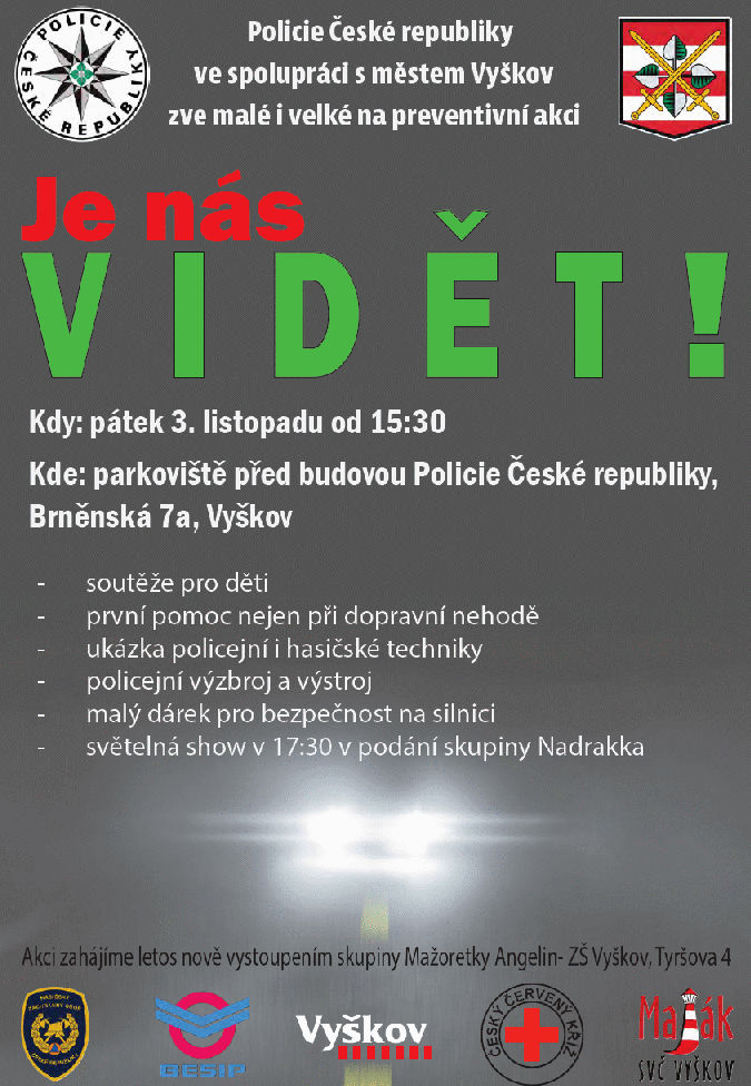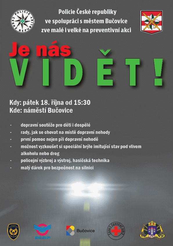 Policie ČR ve spolupráci s městem Bučovice a Vyškov zvou malé i velké na dvě tradiční preventivní akci, které jsou známé pod názvem Je nás vidět! V Bučovicích se akce uskuteční v pátek 18. října od 15:30 na náměstí a ve Vyškově následující pátek 25. října od 16:00 před budovou policie v Brněnské ulici. Pro příchozí budou připraveny různá stanoviště, kde si mohou děti i dospělí otestovat své znalosti v dopravě, vyzkoušet základy první pomoci nebo projít slalom se speciálními brýlemi, které simulují stav, jakoby byl člověk pod vlivem alkoholu nebo drog. Nebude chybět ani policejní a hasičská technika. Každý návštěvník, který se akce zúčastní, dostane dárek v podobě reflexního předmětu. Cílem této preventivní akce je připomenout účastníkům silničního provozu základy bezpečného pohybu na pozemní komunikaci. „Policejní hlídky se budou problematice neosvětlených chodců či cyklistů věnovat i v následujících dnech na celém území Jihomoravského kraje,“ doplnila policejní mluvčí Alice Musilová.