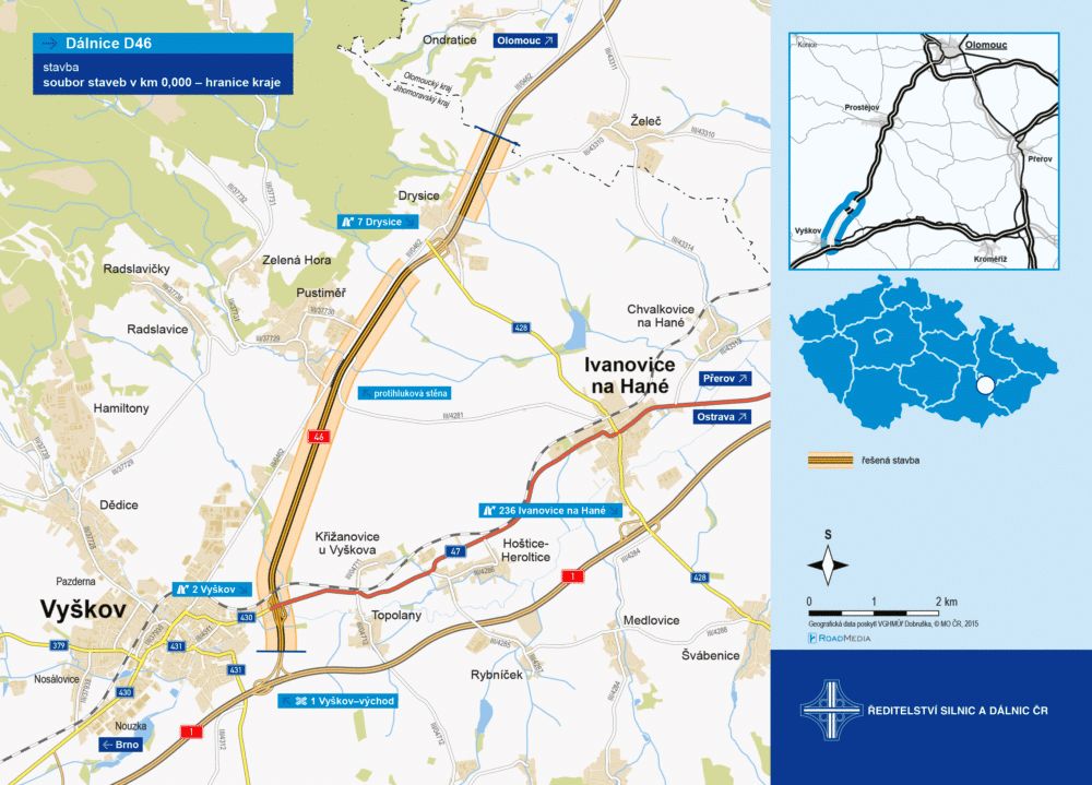 Téměř 40 kilometrů dlouhá D46, které se také říká Hanácká dálnice, vede z Vyškova přes Prostějov do Olomouce. Na 26. kilometru dálnice je estakáda Haná v Prostějově, která se svými 794 metry patří mezi nejdelší dálniční mosty v Česku. ŘSD modernizuje tuto dálnici od roku 2011. Jde o šest staveb včetně upravené mimoúrovňové křižovatky Vyškov. Díky modernizaci se zlepšily parametry tohoto dálničního úseku. Část dálnice může fungovat i jako runway pro stíhací letouny. Práce, které začaly na jaře, stály 461 milionů Kč bez DPH. „Na modernizovaném úseku jsme upravili mimoúrovňovou křižovatku (MÚK) Vyškov, postavili jsme novou protihlukovou stěnu u Pustiměře. Ve směru na Olomouc jsme vybudovali nový most přes řeku Haná, připojovací pruh a položili jsme nové asfaltové vrstvy v téměř sedmikilometrovém úseku,“ uvedl ředitel Závodu Brno ŘSD David Fiala.