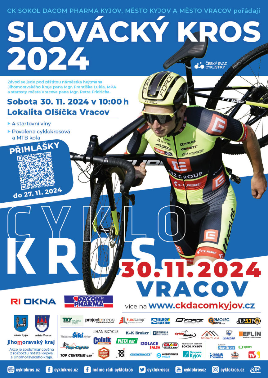 Opět po roce se o víkendu 30. listopadu ve Vracově pojede SLOVÁCKÝ KROS na motokrosové trati a v přilehlém lese v lokalitě Olšíčka, za ulicí Josefa Somra. Start závodů je v 10 hodin a zastoupení budou mít všechny kategorie od přípravky přes juniory až po dospělé, muže i ženy. Časová dotace závodu je od 15 minut pro nejmenší až po 30 minut pro dospělé. Délka jednoho kola je 900 a 1500 metrů. Přihlásit se můžete přes QR kód na přiloženém plakátu, nebo klidně až na místě samotném. K závodění potřebujete jen cyklistickou přilbu a samozřejmě jízdní kolo, ať už cyklokrosové, gravel či MTB. Závodí se nejen o věcné ceny, diplomy a poháry, ale v některých kategoriích i o menší finanční prémii. „Je úplně jedno, jakou máte fyzičku, kolik máte let, na jakém kole pojedete nebo jak moc jste soutěživí. Prostě si přijďte užít vyjížďku krásnou podzimní přírodou. Těšíme se na Vás,” pozval cyklistické nadšence starosta Vracova Petr Fridrich.