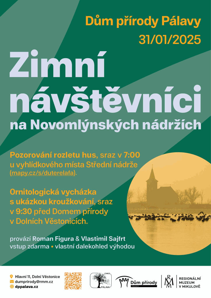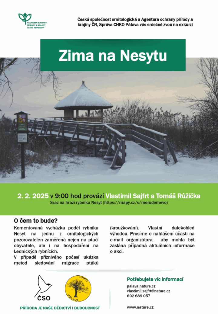 Světový den mokřadů jako připomínka podpisu tzv. Ramsarské úmluvy se blíží. I letos pořádá Dům přírody Pálavy již tradiční akci na Nesytu. Při vycházce v neděli 2. 2. se budou moci návštěvníci seznámit nejen s ptačími obyvateli, ale dozví se i novinky a aktuální informace o tom, co se na lednické rybniční soustavě chystá. Novinkou pro rok 2025 je, že můžete navštívit hned dva mokřady mezinárodního významu v okolí Pálavy. V pátek 31. 1. totiž připravil Dům přírody Pálavy ve spolupráci s CHKO Pálava vycházku na Střední Věstonickou nádrž. V 7:00 bude pozorování rozletu hus. Sraz je u vyhlídkového místa Střední nádrže Vodního díla Nové mlýny, není nutné se registrovat předem, akce je zdarma. Téhož dne v 9:30 bude taky ornitologická vycházka s ukázkou kroužkování. Sraz je před Domem přírody Pálavy v Dolních Věstonicích. Není nutné se registrovat předem, akce je zdarma. V neděli 2. 2. v 9:00 bude komentovaná vycházka podél rybníka Nesyt. Sraz je na hrázi rybníka Nesyt. „Prosíme o nahlášení účasti na email vlastimil.sajfrt@nature.cz,” uvedli ochranáři. Akce jsou zdarma.