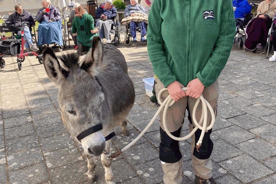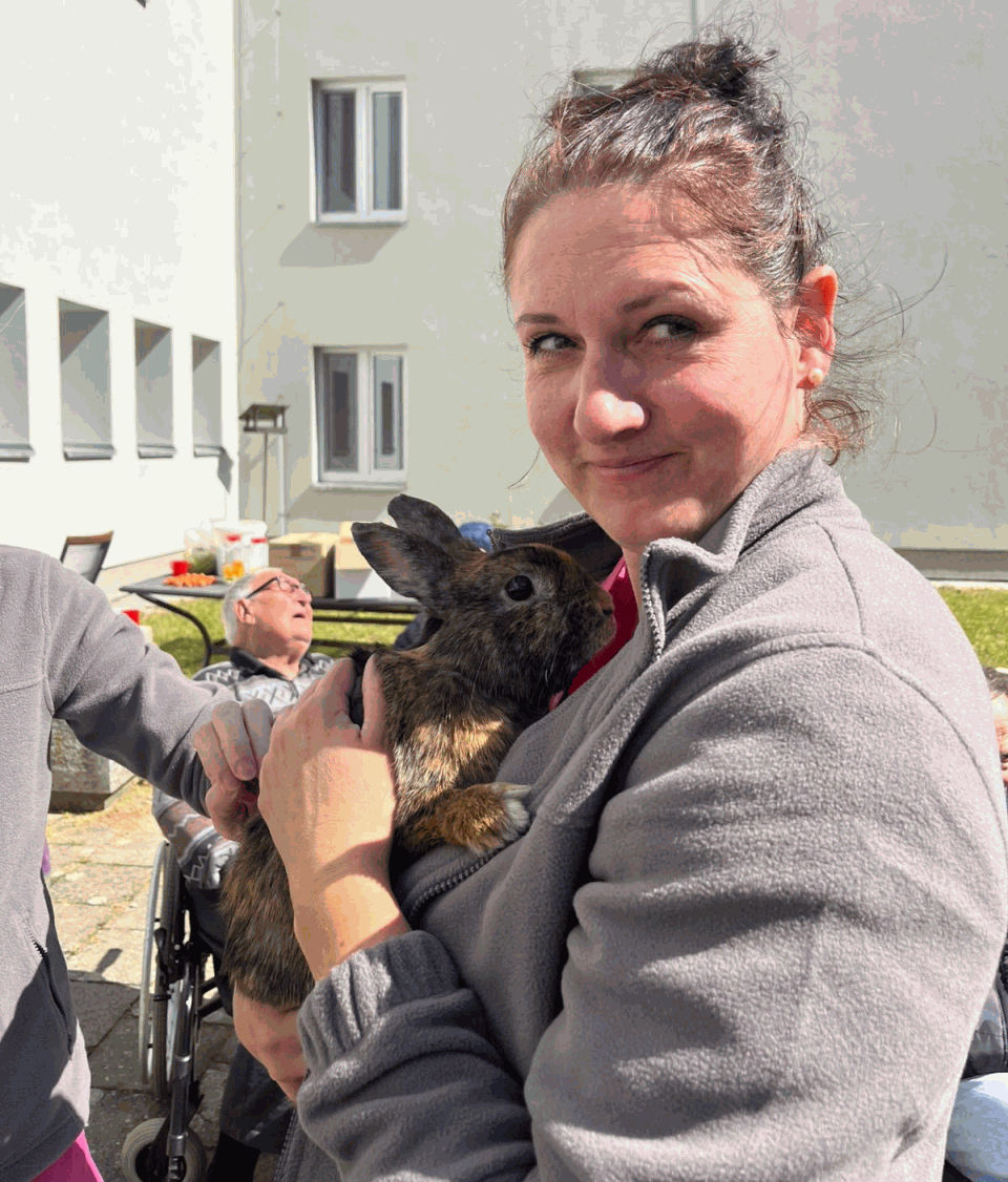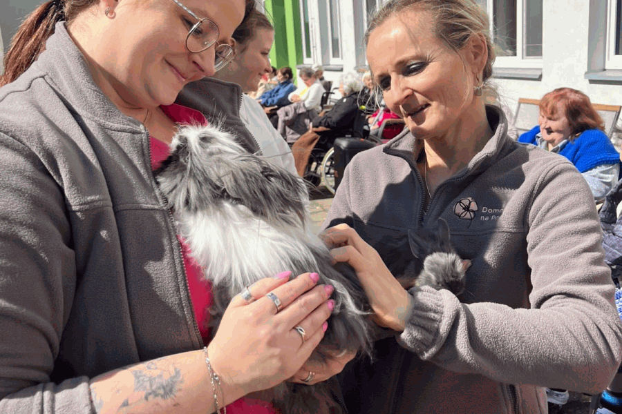 Letos na výlet vyrazil oslík Vilík, poník Valda a oslička Jana. Na pomazlení ošetřovatelky klientům přivezli z Babiččina dvorečku dospělé králíky i s mláďaty a kuřátka mladší než měsíc. Bylo to příjemné setkání pro všechny na sluníčku před budovou domu.