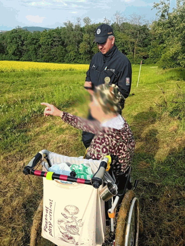 Protože se náhle změnilo počasí a přišla bouřka, turisté neplánovaně změnili trasu, o čemž však vozíčkářka vůbec nevěděla. Pokračovala tak dál po polní cestě, která se však vlivem hustého lijáku postupně změnila v bažinu. S invalidním vozíkem tak zůstala uvězněná na jí naprosto neznámém místě v náročném terénu. Turisté, kteří byli s ženou na výletě, nemohli ženu najít, a proto volali na policii. Rozeběhla se tak rozsáhlá pátrací akce. Policisté nakonec po několika dlouhých desítkách minut ženu vypátrali uvízlou s vozíkem v bahně, značně prochladlou, ale živou a zdravou. Jednoduché pak nebylo ani dopravit seniorku zpět do civilizace. Terén byl tak náročný, že v bahně málem zapadl i policejní vůz. Na pomoc s transportem proto museli přijet i hasiči. „V tomto týdnu se vozíčkářka s policisty setkala znovu. Navštívila je na oddělení, aby jim za záchranu znovu osobně poděkovala,” informoval policejní mluvčí David Chaloupka.