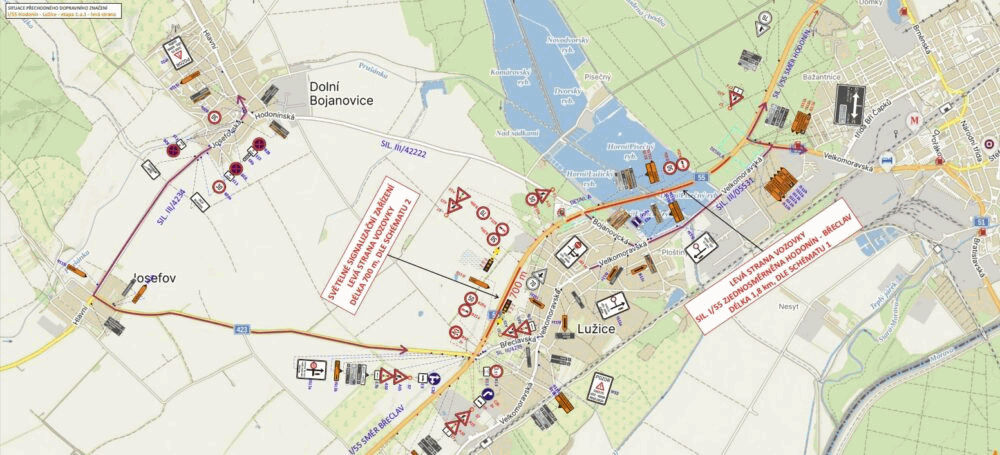 Tříkilometrový úsek silnice I/55 mezi Hodonínem a Lužicemi se bude opravovat od 11. srpna do 18. října. Práce budou rozděleny do několika etap, ke kterým se vztahuje související dopravní omezení. V první etapě prací bude provoz veden po objízdné trase přes Josefov a Dolní Bojanovice a částečně kyvadlově na semafory. Ve druhé etapě budou provoz v úseku v délce 670 metrů řídit semafory. „Silnice I/55 je v opravovaném úseku velmi vytížená. Denně po ní projede zhruba 13 tisíc vozidel. Oprava vyjde na 50 milionů korun bez DPH,” dodalo město Hodonín na své stránce.