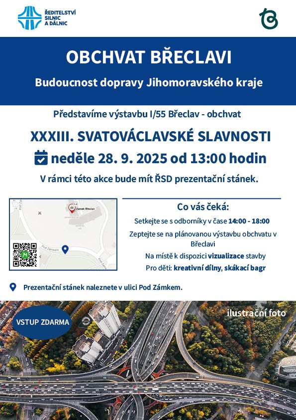Ředitelství silnic a dálnic v neděli 28. září odpoledne postaví svůj prezentační stran v areálu podzámčí. „Dobře si uvědomuji, že pro obyvatele Břeclavi je stavba obchvatu důležitým tématem, ke kterému mají řadu otázek. Právě proto jsem požádal Ředitelství silnic a dálnic o prezentaci během svatováclavských slavností, které navštěvují stovky Břeclavanů. Využijte této příležitosti a přijďte se zeptat na všechno, co vás k obchvatu zajímá,“ zve na nedělní odpoledne pod zámkem starosta Břeclavi Svatopluk Pěček.