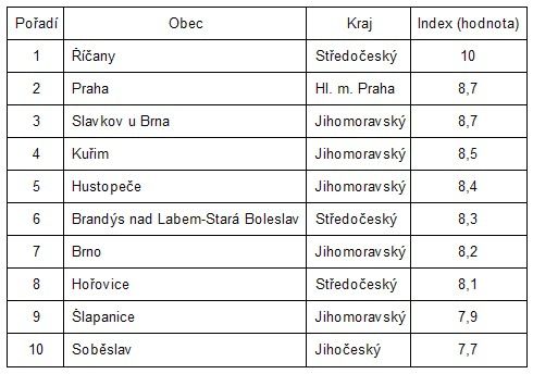 Projekt Obce v datech letos opět porovnal kvalitu života ve všech 26 obcích s rozšířenou působností v celém Česku. Zatímco první dvě příčky zůstávají stejné jako loni, bronzovou příčku letos získal Slavkov u Brna, který odsunul Hustopeče a Kuřim. „Výsledky dlouhodobě ukazují trend, že se nejlépe žije v menších městech v těsné blízkosti velkých metropolí. Tato města těží z výborné dostupnosti služeb, pracovních příležitostí velkoměsta, ale zároveň nabízejí klidnější životní prostředí,“ uvedl za Obce v datech Michal Vaňáč.