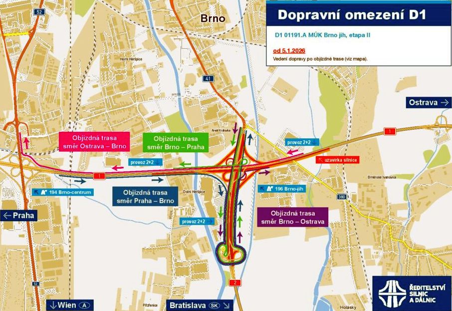 Řidičům, kteří jezdí po dálnici D1 nebo D2 připomínáme, že od pondělního rána na dálnici D1 u mimoúrovňové křižovatky Brno jih jezdí auta ve dvou zúžených pruzích v každém směru, a to v jízdním pásu na Prahu. Ten na Ostravu je již uzavřený a ŘSD pracuje na jeho rozšíření. Na dálnici D2 ve stejném režimu 2+2 řidiči jezdí v jízdním pásu směrem na Bratislavu.