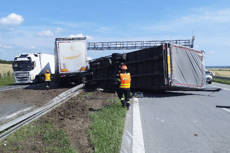 Na dálnici D2 u Staroviček na Břeclavsku se převrátil kamion
