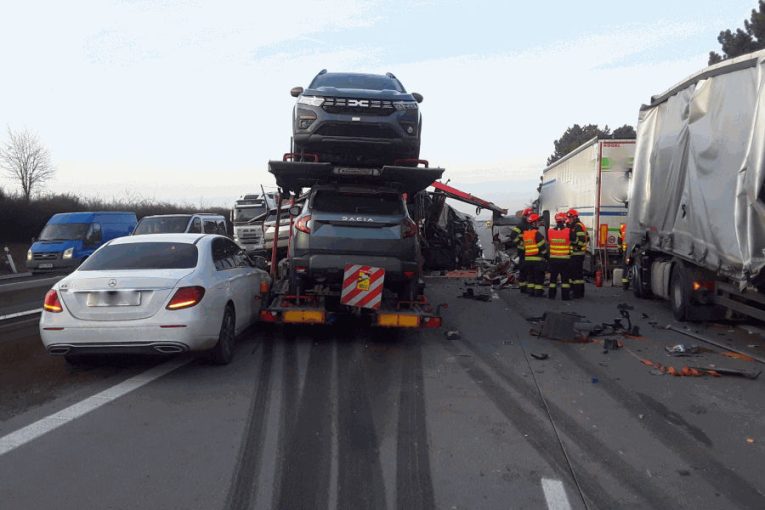 Vážná nehoda na dálnici D2: Srazil se kamion s tahačem plným aut, letěl i vrtulník