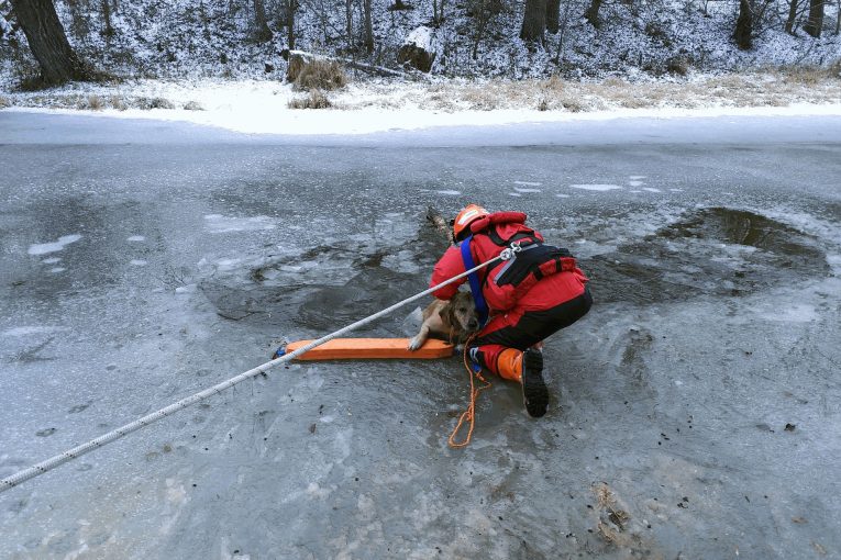 V Ivančicích se probořili dva psi na ledu. Hasiči je zachránili