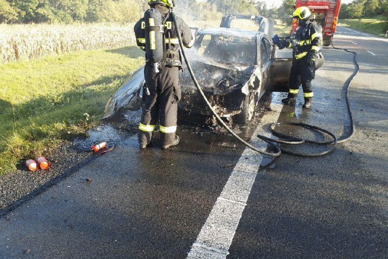 Požár osobního auta likvidovali hasiči na I/52 u Pasohlávek