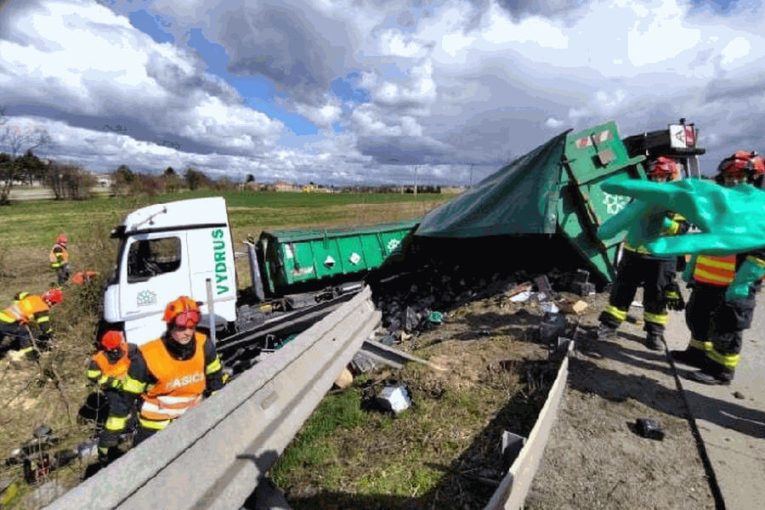 Nehoda kamionu na D1 u Rousínova: Vysypal se nebezpečný náklad
