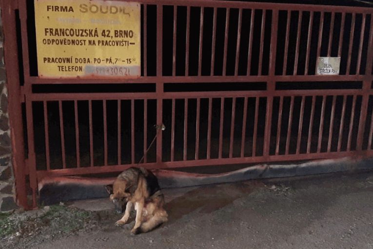 Fenka německého ovčáka dlouhodobě trpěla, majitel ji přivázal k bráně