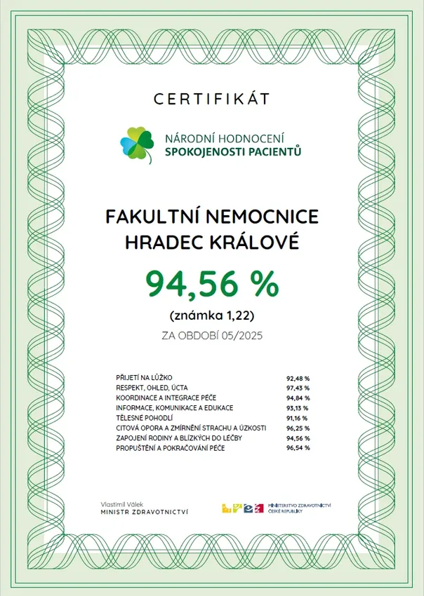 Národní hodnocení spokojenosti pacientů se uskutečnilo v květnu 2025 na 58 lůžkových odděleních nemocnice. Dotazníky vyplnilo přibližně tisíc hospitalizovaných pacientů, kteří nejčastěji vyzdvihovali vysokou kvalitu poskytované zdravotní péče, profesionalitu personálu a jeho vstřícný přístup. Výsledné hodnocení 94,56 % potvrzuje stabilně vysoký standard péče, který nemocnice dlouhodobě udržuje.