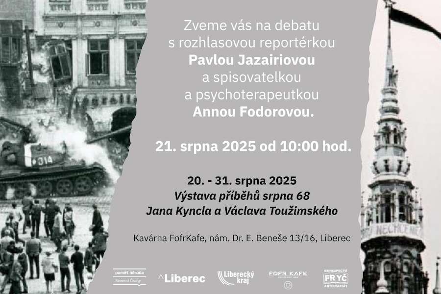 - Výstava Srpen 1968 v Liberci: Portréty horolezce Jana Kyncla a fotografa Václava Toužimského. Vidět ji můžete v Kavárně FofrKafe na náměstí Dr. B. Beneše od 20. do 31. srpna 2025. Oba autoři se srpnem 1968 úzce souvisí. Jan Kyncl na protest proti okupaci vylezl s kamarády na špici liberecké radnice, aby tam vyvěsili smuteční prapor, a pan Toužimský je autorem všeobecně známé fotografie tanku bořícího podloubí a celé série dalších snímků z počátku invaze v Liberci.