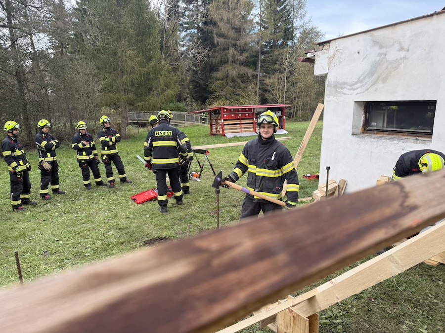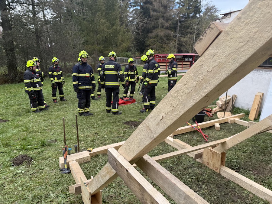 Při výcviku praktických dovedností se zaměřili na práci s výdřevou, absolvovali jej prakticky všichni liberečtí hasiči. „Jsme rozdělení na dvě skupiny, máme tu dvě výcviková stanoviště, a to venkovní a vnitřní,“ popisuje mjr. Jan Pluhař, velitel liberecké stanice a vedoucí praktického výcviku. „Venkovní skupina zajišťuje svislé stavební konstrukce, v tomto případě obvodovou zeď a staví takzvané rejkry,“ vysvětluje Jan Pluhař a dodává: „Uvnitř budovy cvičící zabezpečují vodorovnou stavební konstrukci – strop. Staví takzvanou věžovou konstrukci, později se skupiny vymění.“
